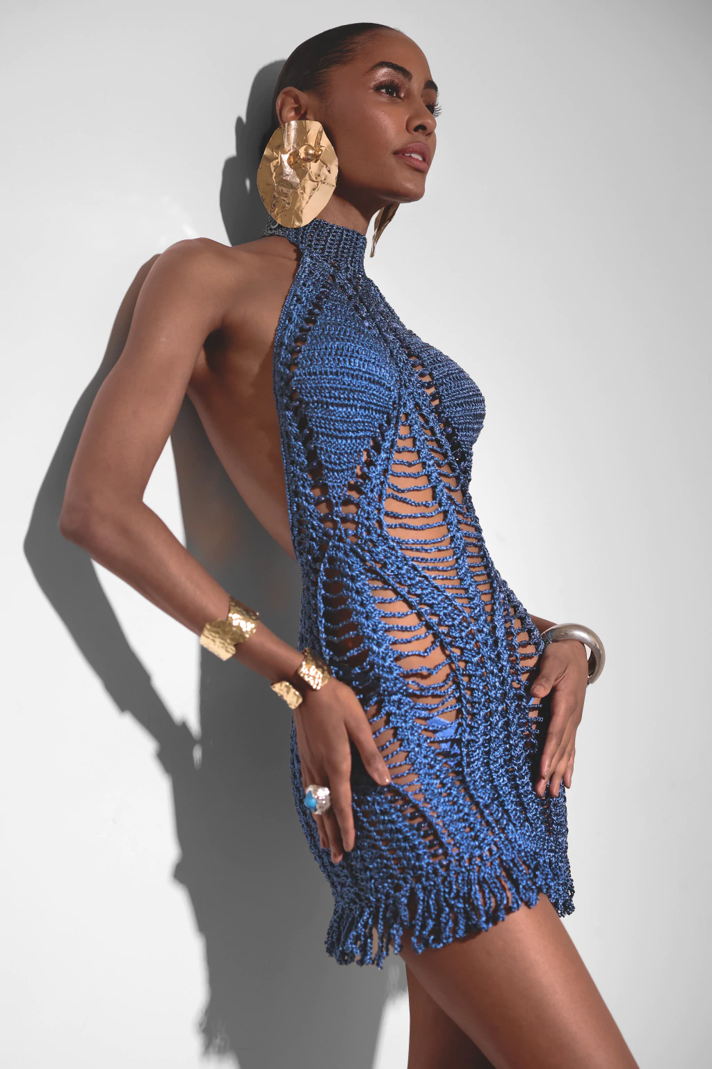 Confeccionado 100% à mão com fios de alta qualidade na cor azul royal, que valoriza todos os tons de pele e confere um toque contemporâneo e elegante à peça. Este modelo apresenta uma silhueta justa ao corpo, com tramas elaboradas em desenhos vazados que criam um efeito de transparência sensual, perfeito para ocasiões especiais à beira-mar, festas sunset ou como sobreposição para looks de praia sofisticados. Seu design halter neck (gola alta) garante sustentação e destaca os ombros e o colo de forma elegante. As costas são completamente abertas, conferindo um visual ousado e moderno, com fecho no pescoço para melhor ajuste. Destaque para os pequenos acessórios redondos aplicados ao longo das tramas, que adicionam brilho e textura à peça, reforçando o trabalho minucioso do crochê e dando um toque de originalidade artesanal. A barra é finalizada com franjas delicadas, que criam movimento e leveza ao caminhar, tornando o look ainda mais impactante.