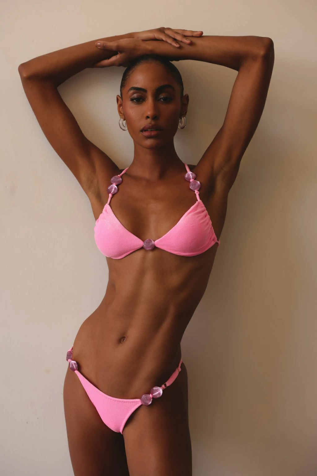 Top com bojo removível e alças finas ajustáveis, que oferecem sustentação na medida certa. O destaque fica por conta das esferas decorativas posicionadas nas alças e ao centro do busto, trazendo um toque moderno e divertido à peça. Ideal para quem busca um visual vibrante e cheio de personalidade.
